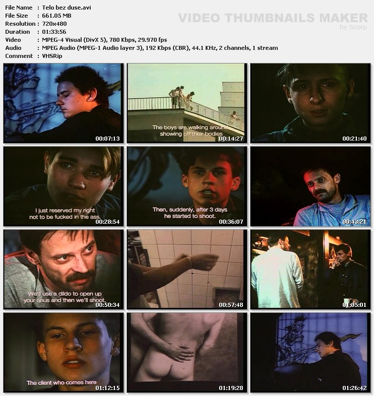 Documentary look at doomed male prostitutes in Prague, ages 15 to 18, who troll at the public swimming pool, the train station, a video arcade, and a disco. After the boys talk about how they got in the game, the camera follows them to the home of Pavel Rousek. Under the name Hans Miller, he makes gay porno videos, primarily for German distribution. Intercut with a movie shoot chez Rousek is an interview that follows him to his day job at a morgue, where he performs an autopsy as he talks about his work. The sex is without protection; the boys are without family. They talk about their bodies and souls, money, their sexual orientation, AIDS, their dreams, and death.